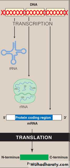 messenger RNAs that are translated into sequences of amino acids (polypeptide chains or proteins),ribosomal RNAs,