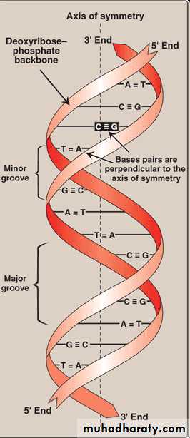 In the double helix, the two chains are coiled around a common axis called the axis of symmetry. The chains are paired in an antiparallel manner, that is, the 5′-end of one strand is paired with the 3′-end of the other strand.In the DNA helix, the hydrophilic deoxyribose–phosphate backbone of each chain is on the outside of the molecule, whereas the hydrophobic bases are stacked inside. The overall structure resembles a twisted ladder.