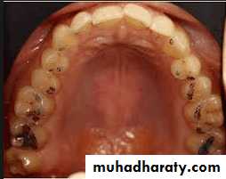 • Presence of large number of restored teeth, signs of recurrent caries, the evidence of decalcification – susceptible to caries
