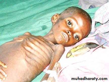 The muscles are usually wasted as a result many children regress in their physical development.Anemia is usually present and may be severe.