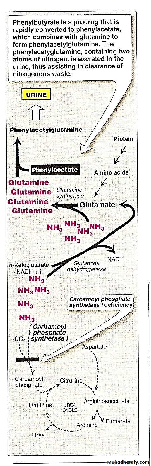 Phenylbutyrate given orally converted to phenylacetate.This condenses with glutamine to form phenylacetylglutamine which is excreted in the urine