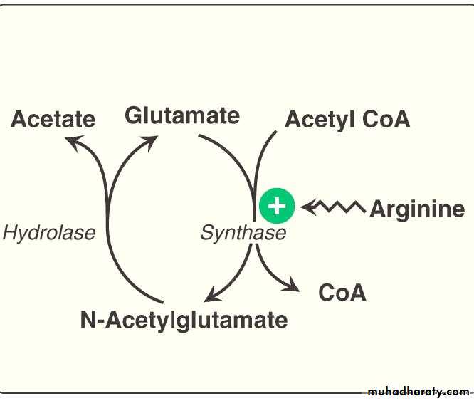 N-Acetylglutamate is an essential activator of carbamyl phospate synthetase- the rate limiting step in urea cycle. N- Acetylglutamate is synthesized from acetyl CoA and glutamate by N-acetylglutamate synthase in a reaction for which arginine is an activator..