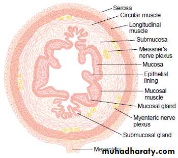the intestinal wall, including the following layers from outer surface inward: (1) the serosa, (2) a longitudinal muscle layer, (3) a circular muscle layer, (4) the submucosa, and (5) the mucosa. In addition, sparse bundles of smooth muscle fibers, the mucosal muscle, lie in the deeper layers of the mucosa. The motor functions of the gut are performed by the different layers of smooth muscle.
