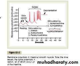 The smooth muscle of the GIT is excited by continual slow, intrinsic electrical activity along the membranes of muscle fibers. This activity has three types of electrical waves.