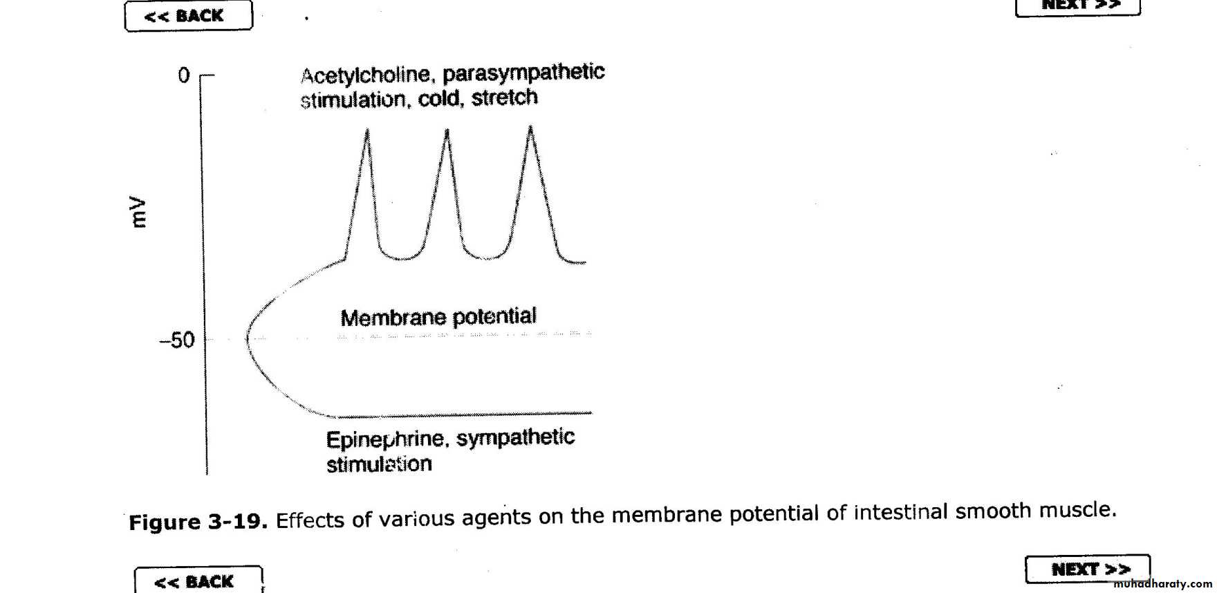 Are true action potential. The normal resting membrane potential (RMP) in smooth muscle fibers of GIT between is -50 to -60mv. the channels responsible for the action potentials are calcium -sodium channels , they allow large numbers of calcium ions to enter along with smaller numbers of sodium ions .These channels are much slower to open and close .