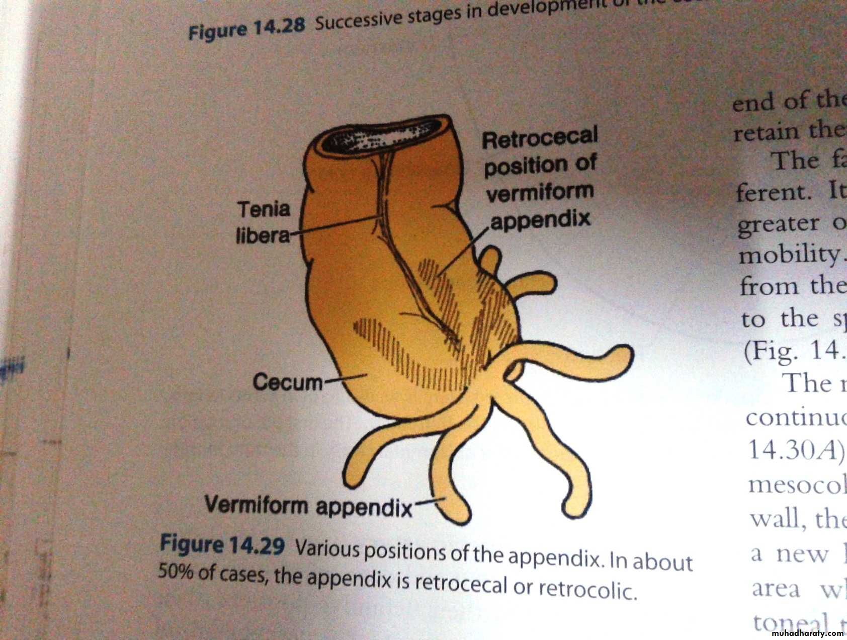 The caecum the descends from just below the liver to reach its adult position (the right iliac fossa).