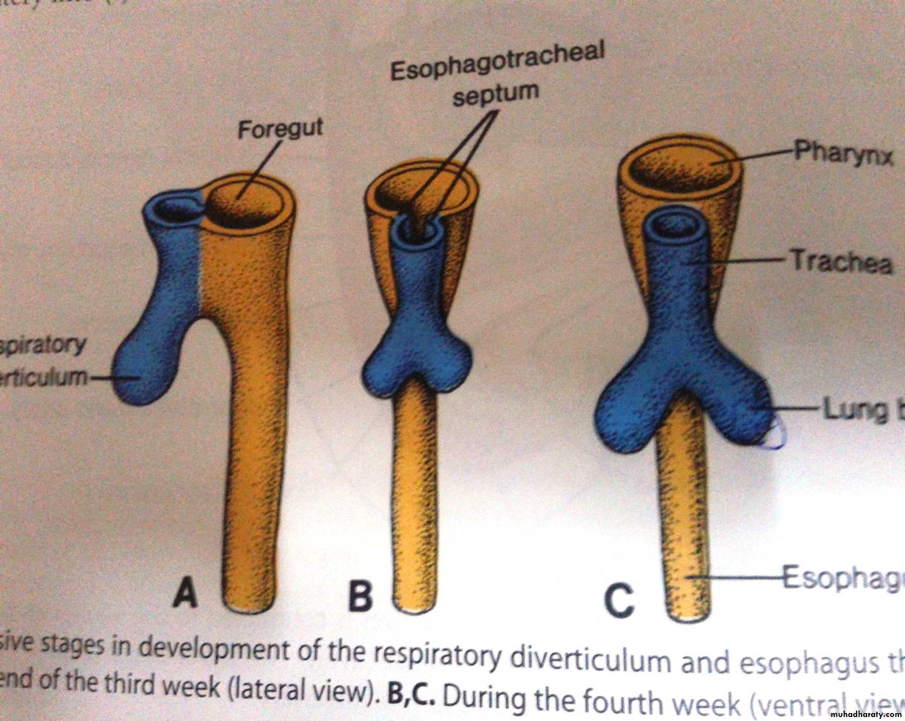 The esophagus develops the foregut just caudal to the opening of the laryngotracheal tube.