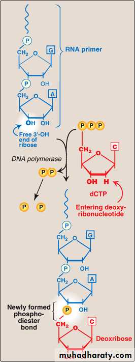 The mechanism for that is that free “OH” at the 3′ end of the RNA primer serves as an acceptor for the new complementary deoxyribonucleotides when DNA polymerases join them forming phosphodiester bonds.