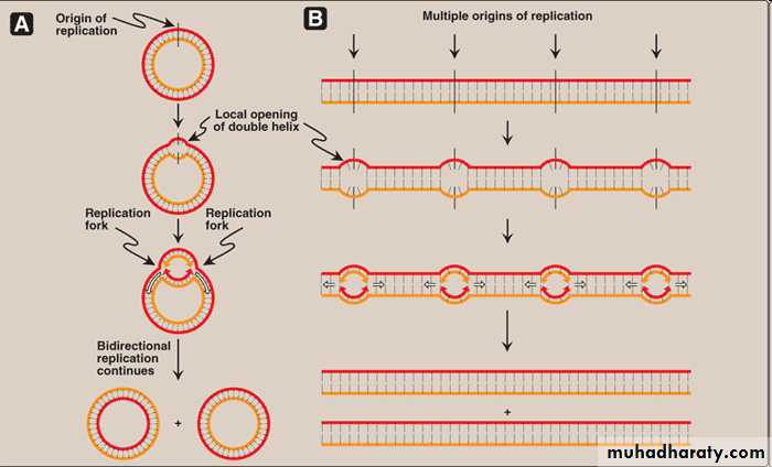 In eukaryotic cells, replication begins at multiple sites along the DNA double helix, thus providing a mechanism of rapidly replicating the great length of the eukaryotic DNA molecule.