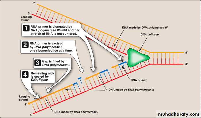Once DNA polymerase III add the first nucleotide to the 3′-OH end of the RNA primers, it continuously add nucleoside monophosphates in 5′→3′ direction over the DNA template until it is blocked by another neighboring RNA primer.At this time, RNA primer will be excised and replaced by DNA nucleotides by the action of the enzyme DNA polymerase I. This enzyme has got a 5′→3′ exonuclease activity that act to remove the RNA primer in 5′→3′ direction removing one nucleotide at each time and replacing the gap by DNA nucleotides until RNA is totally removed and replaced by DNA.