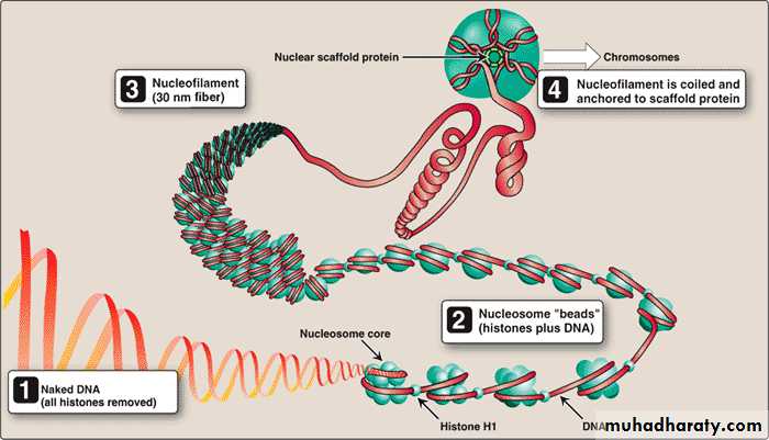 This structure assumes the shape of a coil, often referred to as a 30-nm fiber.
