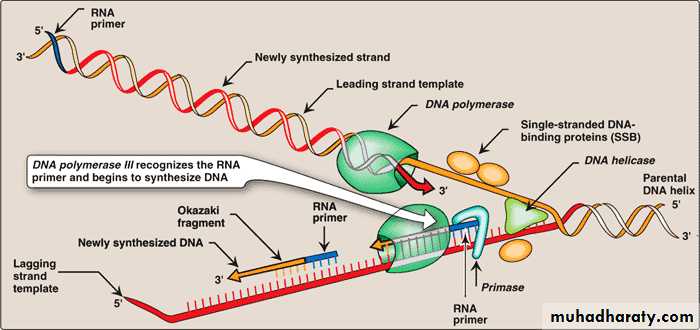 The newly formed 5′→3′ DNA strands are being elongated using DNA- polymerase III. This enzyme will begin to add new deoxyribonucleotides along the single-stranded template that specifies the sequence of bases in the newly synthesized chain.DNA polymerase III is a highly “processive” enzyme—that is, it remains bound to the template strand as it moves along, and does not diffuse away and rebind before adding each new nucleotides.