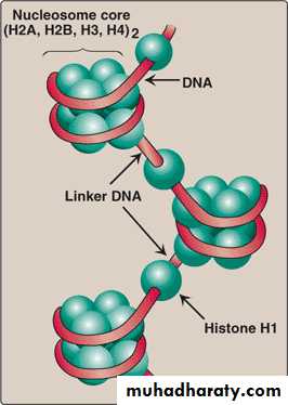 Eukaryotic DNA is associated with tightly bound basic proteins, called histones. These serve to order the DNA into small structural units, called nucleosomes, that resemble beads on a string.