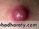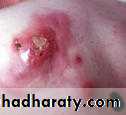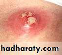 - As the swelling enlarges its central part become soft, but no fluctuation, multiple areas of skin thin out and separate forming multiple sinuses through which slough come out with little pus.