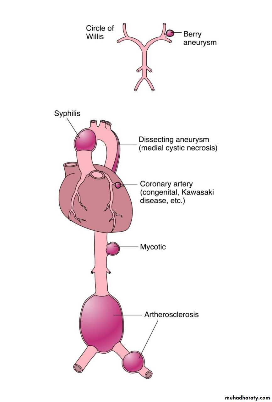 Mycotic aneurysm (infection of arterial wall). (1- from embolization of septic embolus usually in infective endocarditis, 2- extension of adjacent suppurative process, 3- circulating organisms directly infecting the arterial wall).