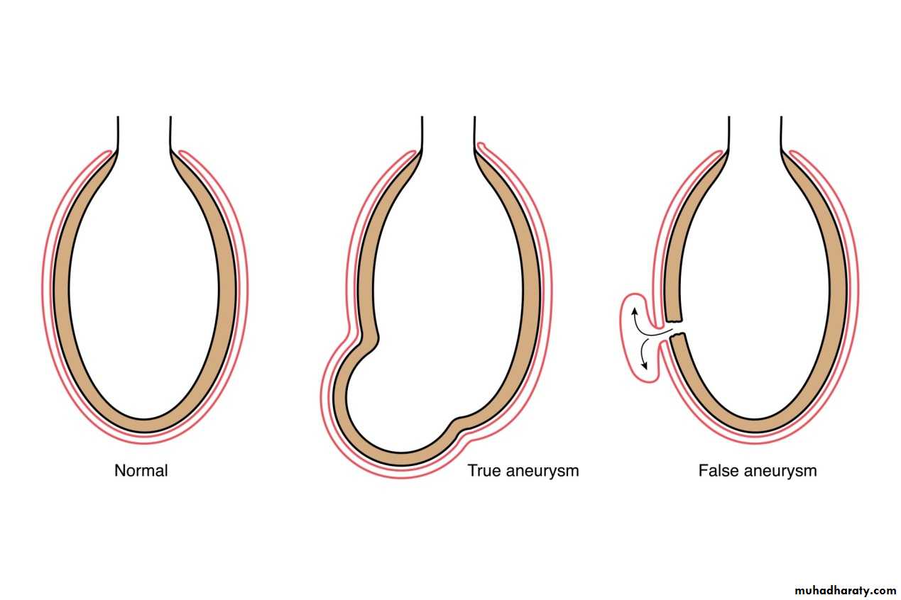 It is a localized abnormal dilation of a blood vessel or the heart, it can be congenital or acquired. When an aneurysm involves an intact attenuated arterial wall or thinned ventricular wall of the heart, it is called a true aneurysm. In contrast, a false aneurysm (also called pseudo-aneurysm) is a defect in the vascular wall leading to an extravascular hematoma that freely communicates with the intravascular space (“pulsating hematoma”).