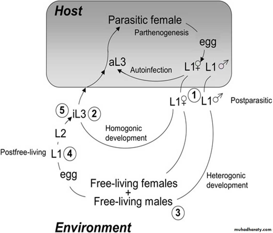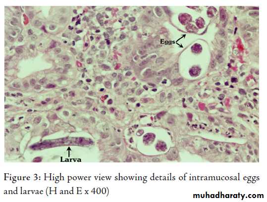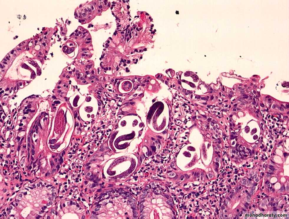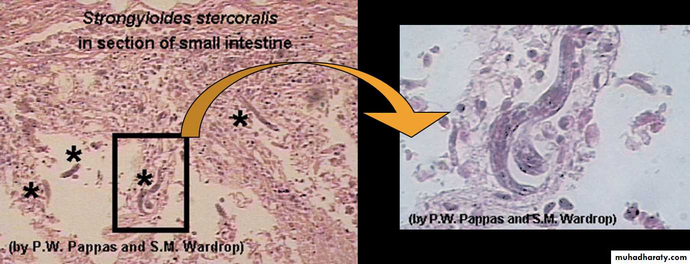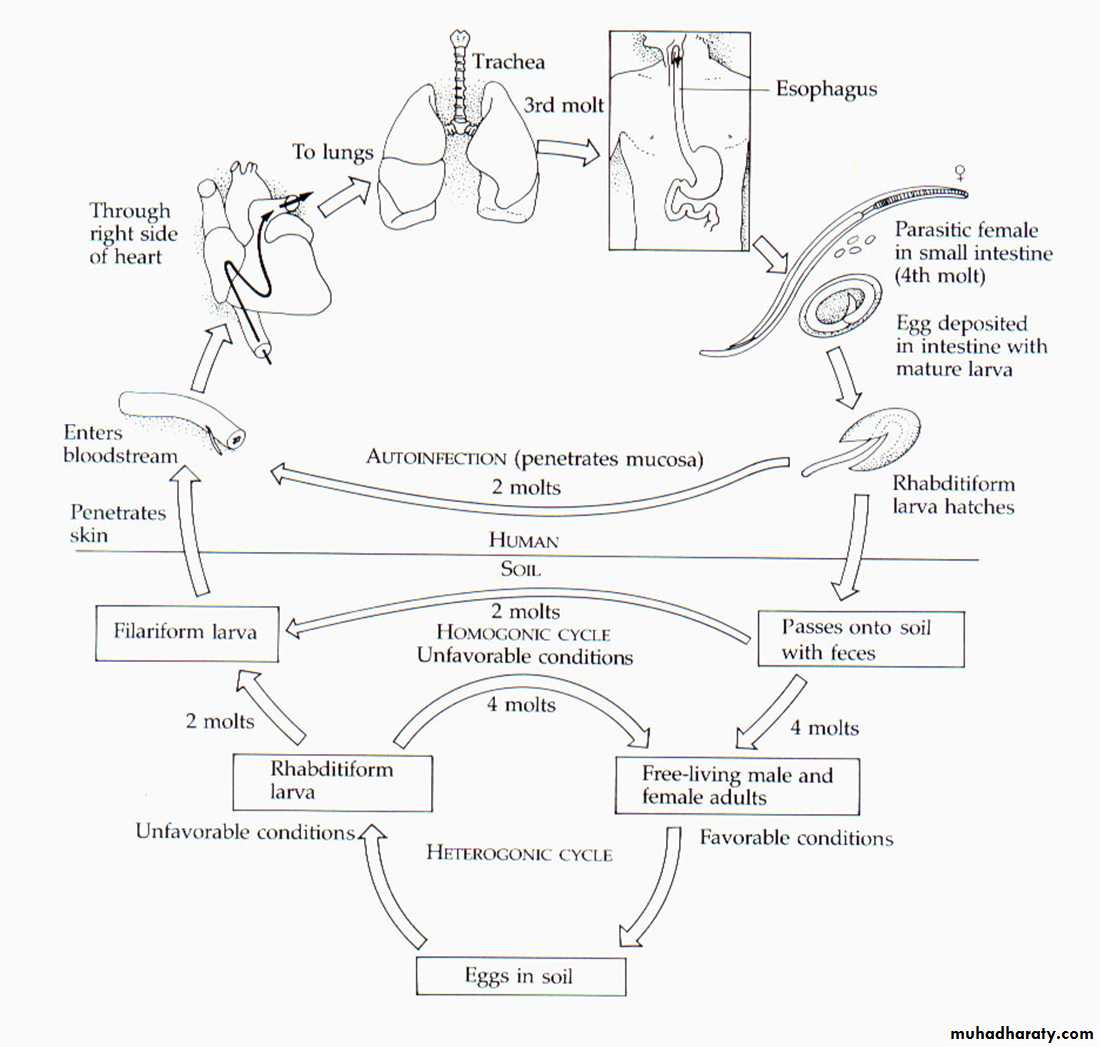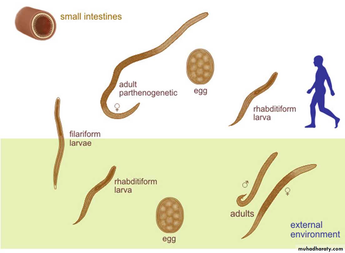 Eggs are laid in the mucosa, hatch into rhabditiform larvae that penetrate the glandular epithelium and pass into the lumen of the intestine and out the feces