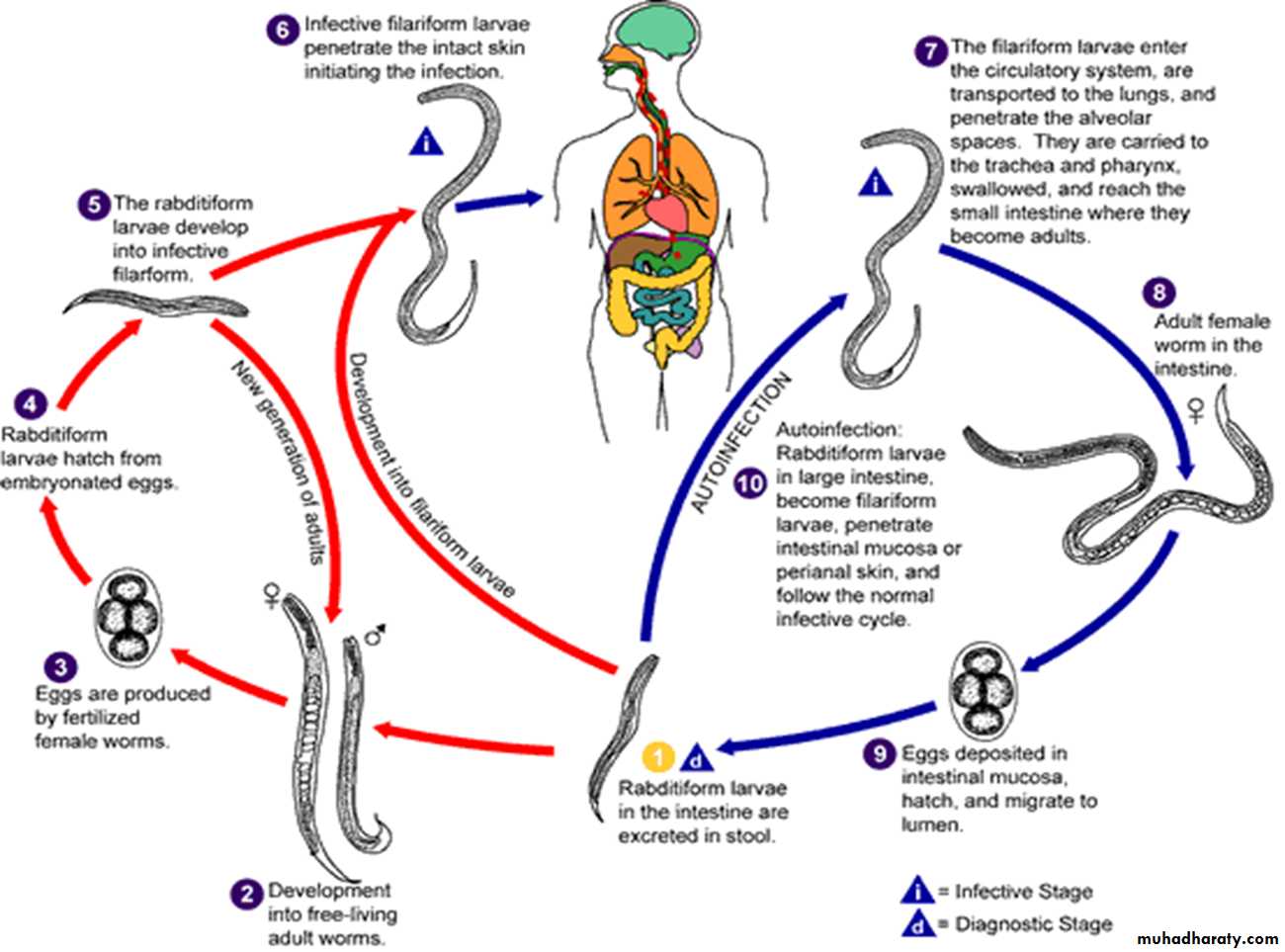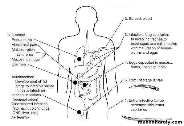 Diagnostic stage: First stage larvae(Rhabditiform) in feces.