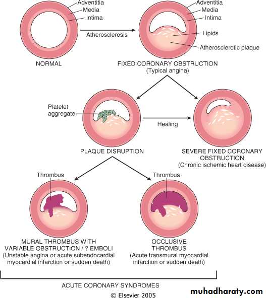 The initial event is a sudden change in an atheromatous plaque, which may consist of intraplaque hemorrhage, erosion, ulceration, or rupture or fissuring.