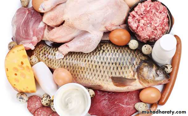 1.Animal source proteins: usually contain all the essential amino-acids in a suitable proportion. Thus it considered a first class proteins.[Meat, Fish, Milk & its derivatives, and Eggs] 2.Vegetable source proteins: the amount of proteins in plant cells is small in general . However, its amount is variable according to type of plant .[Potatoes , Beans, Peas, Nuts, Bran]