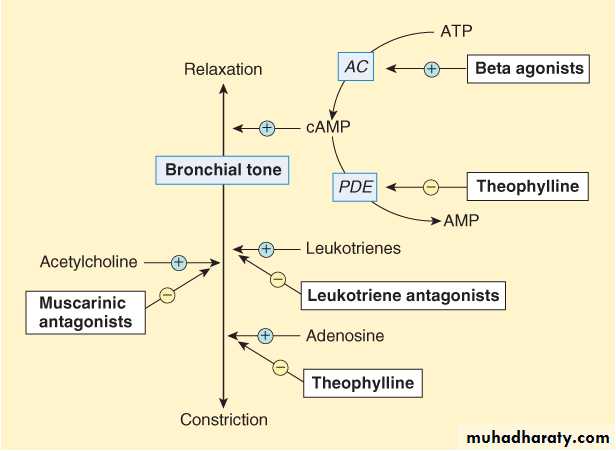 Theophylline, a methylxanthine• Inhibition of phosphodiesterase (PDE),since this enzyme hydrolyzes cyclic nucleotides and this lead to increase cAMP