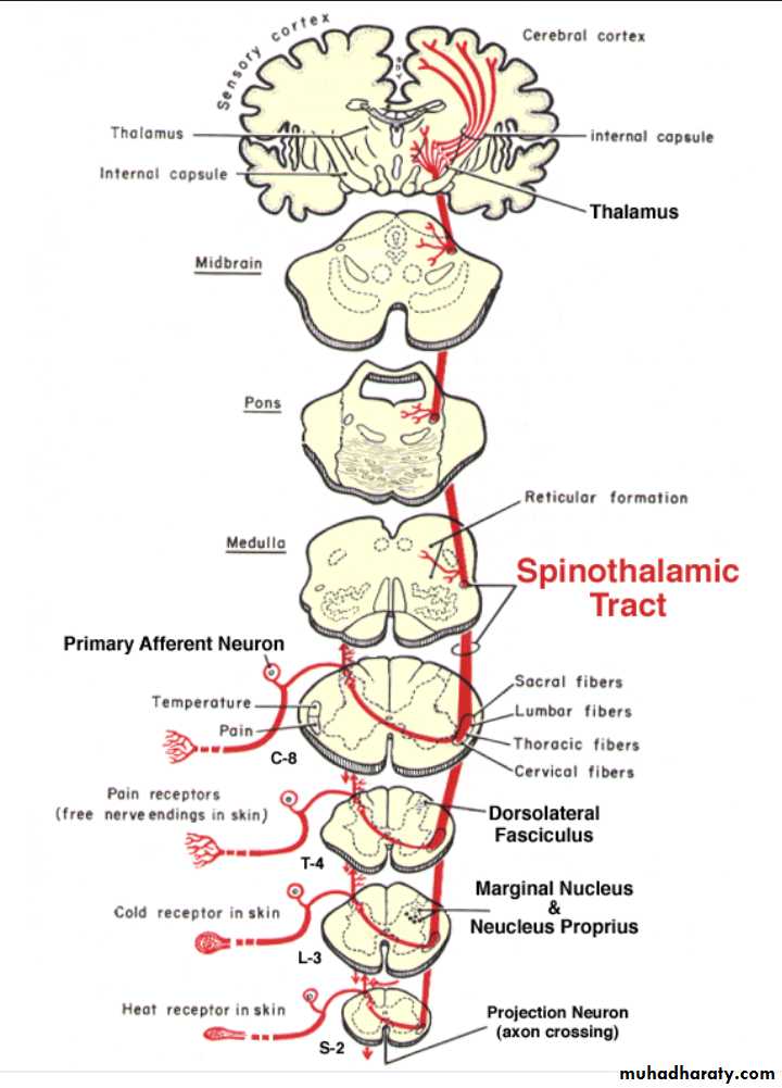 In general, thermal signals are transmitted in pathways parallel to those for pain signals. On entering the spinal cord, the signals transmitted by anterolateral sensory tract and terminate in both• the reticular areas of the brain stem and