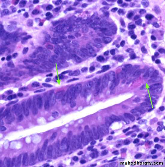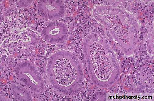 Early phase: neutrophils accumulate within the depths of the crypts of Leiberkuhn forming crypt abscesses.
