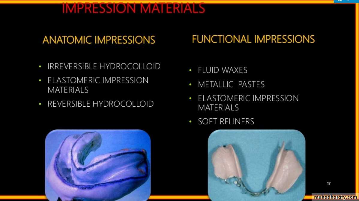 Anatomical Impressions‘Anatomical form’ is the surface contour of the ridge when it is not under any occlusal load .This resting form is recorded with soft impression materials like alginate, plaster of Paris, etc. Other impression materials like elastic putties tend to displace and distort the soft tissues due to their high viscosity