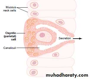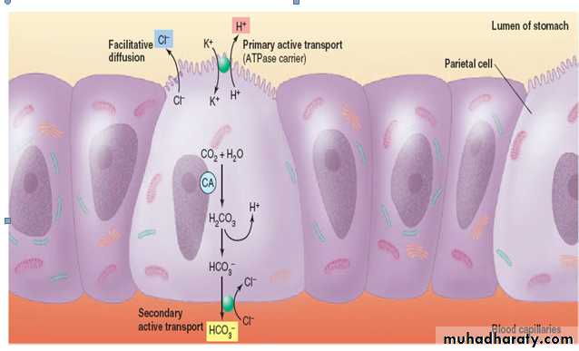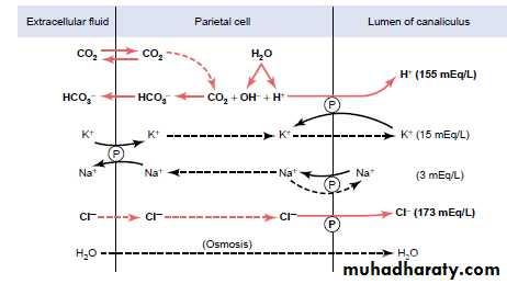 2. Water becomes dissociated into hydrogen ions (H+) and hydroxyl ion (OH-) in the cell cytoplasm .The H+ are actively secrete into the canaliculus in exchange with K+. This active exchange process is catalyzed by H+- K+ ATPase. In addition Na+ is reabsorbed actively in exchange With K+ by Na+- K+ Pump ,and H+ take their place in the canaliculus giving a strong solution of HCl in the canaliculus. And HCl from canaliculus move into the lumen of the gland.