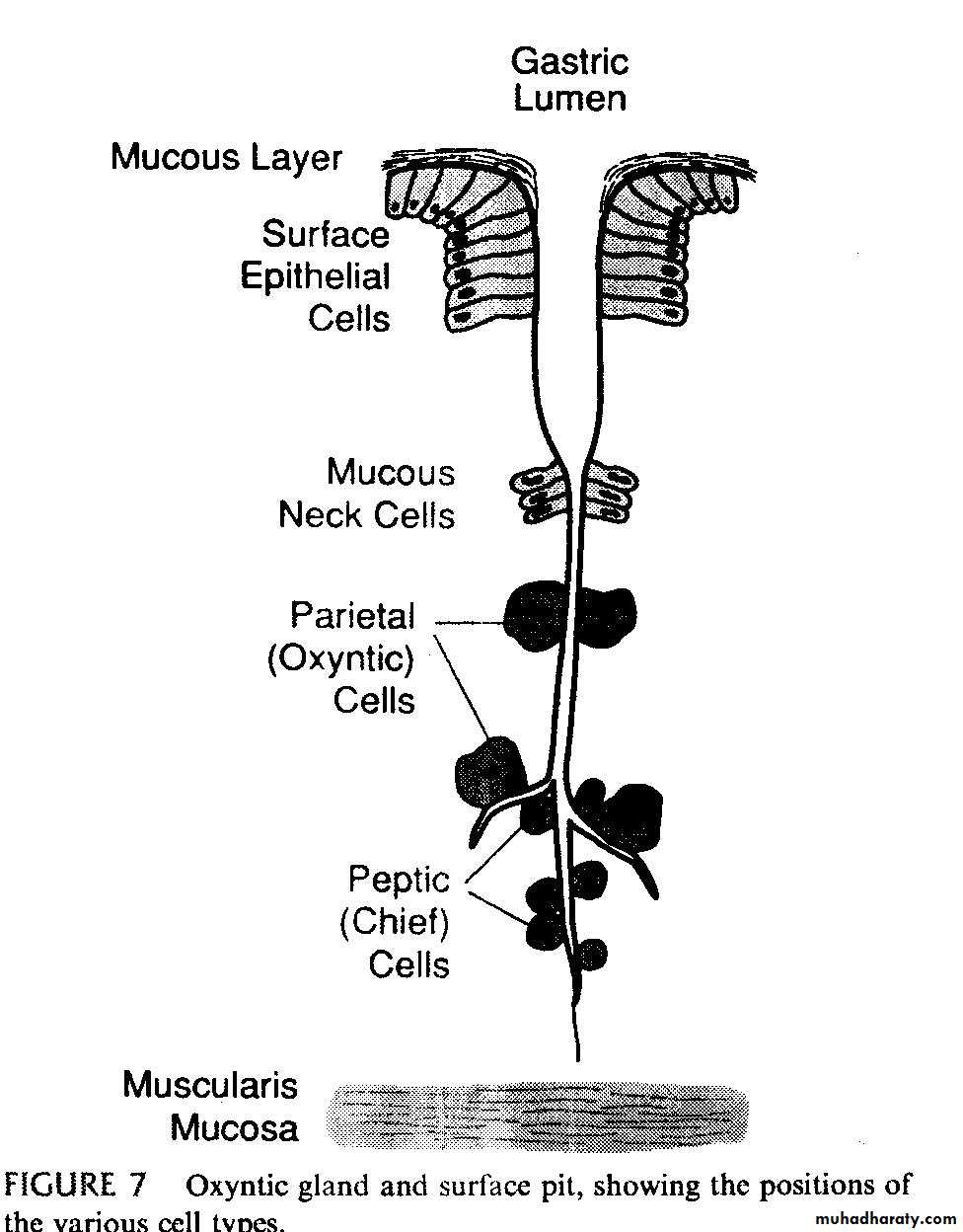 Is secreted by mucous neck cells of oxyntic glands also by pyloric glands . the entire surface of the stomach mucosa between glands has a continuous layer of special type of mucous cells called surface mucous cells .