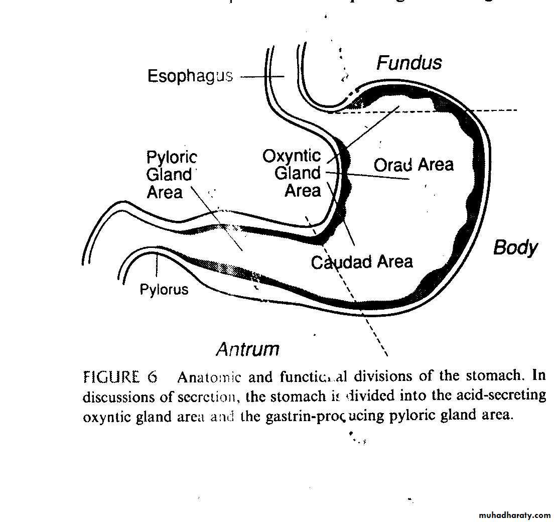 The stomach can be divided into :a. cardiac region which is a small area near the esophageal opening .