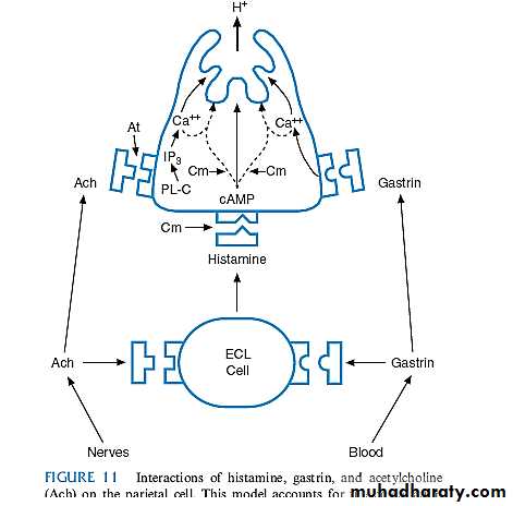 The rate of formation and secretion of HCl – by parietal cell is directly related to the amount of histamine secreted by the ECL cells . in turn the ECL cells can be stimulated to secrete histamine in several ways :