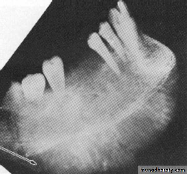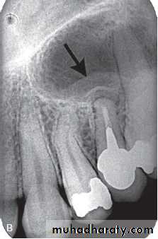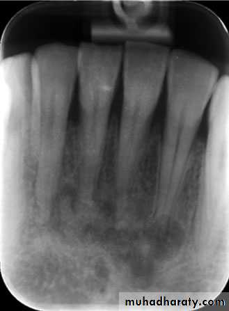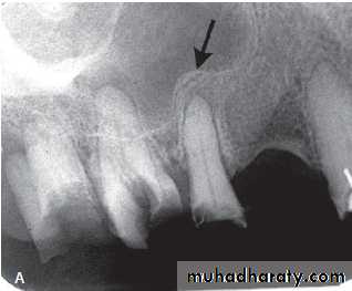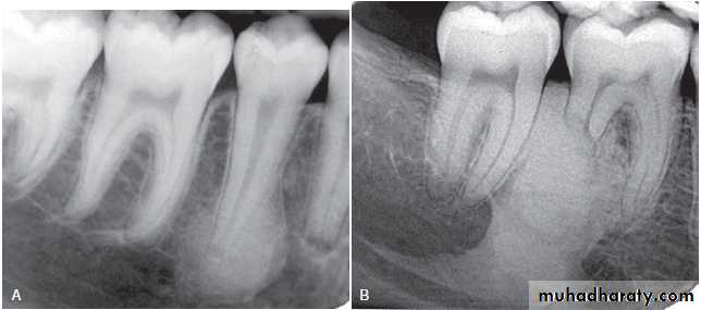 • Cyst → displacement of adjacent structures & expansion of outer cortical boundaries of the jaw.±>1 cm → radicular cyst.
