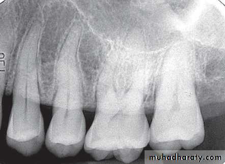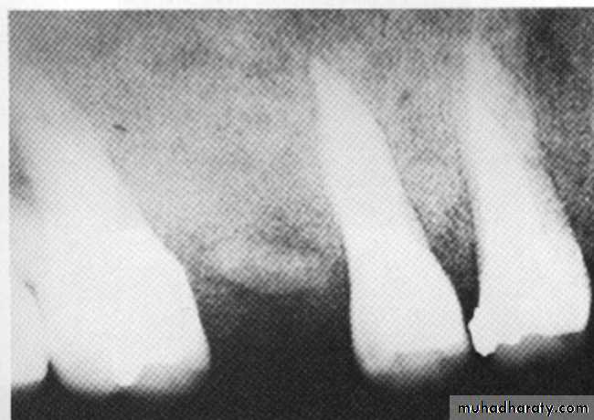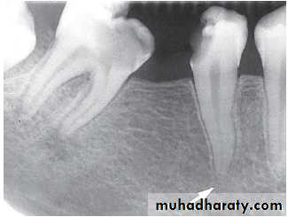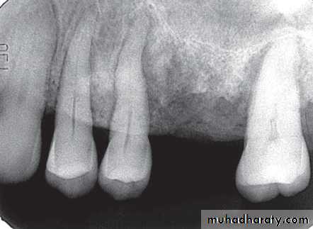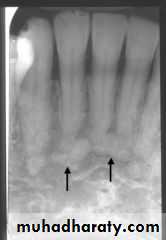 • Periapical granuloma or cyst: Small radiolucent lesion with well defined periphery simulating a cortex.