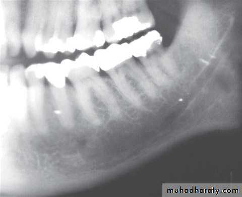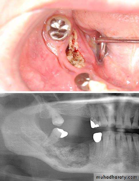 • Occasional evidence of radiopaque sequestra of dead bone.
