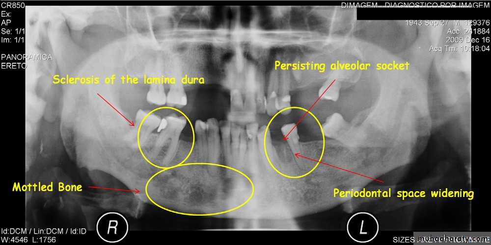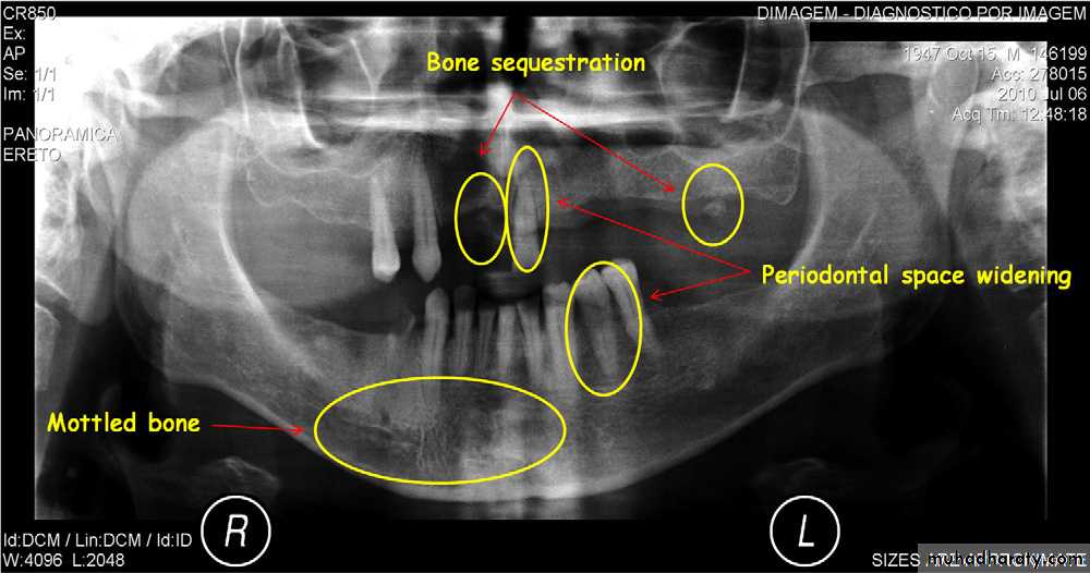 • Presence of sequestra . • Increase in bone sclerosis. • Widening of PDL space • Thicknening of lamina dura.
