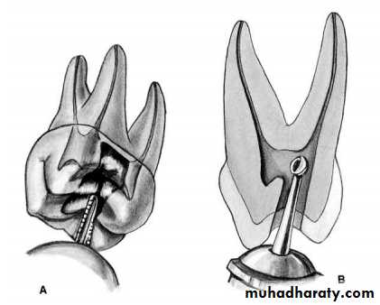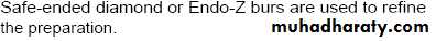 several types of burs will be used to accomplish good access preparation. Fissure burs are used in the initial stage of access preparation to establish the correct outline form ,Round burs are used to lift the roof of the pulp chamber and eliminate overhanging dentine ,Tapered Non end-cutting bur is used to 'lift lid' of pulp chamber and refine cavity.
