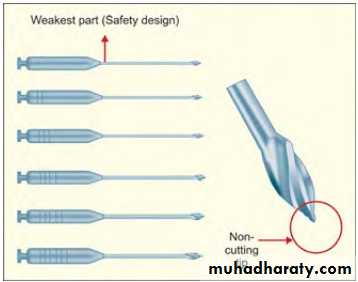 • Hedstrom files cut only when instrument is withdrawn because its edges face the handle of the instrument.• When used in torquing motion, their edges can engage in the dentin of root canal wall and causing H - files to fracture.
