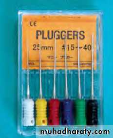 • They are used for vertical compaction of gutta-percha. They apply controlled pressure while compaction, and have more tactile sensitivity than hand plugger.Care should be taken with spreaders and pluggers while compacting the gutta-percha in canals. They should be cleaned prior to their insertion into the canal; otherwise the set sealer from previous insertion may roughen their surface and may pull the cone outside the canal rather than packing it. Also one should discard the instrument when it has become bent or screwed to avoid instrument separation while compaction.