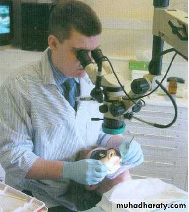 Illumination and magnification are vital for the location of root canals. The endodontist would use a surgical microscope while a general dental practitioner might have loupes and a headlight that give excellent magnification and illumination.