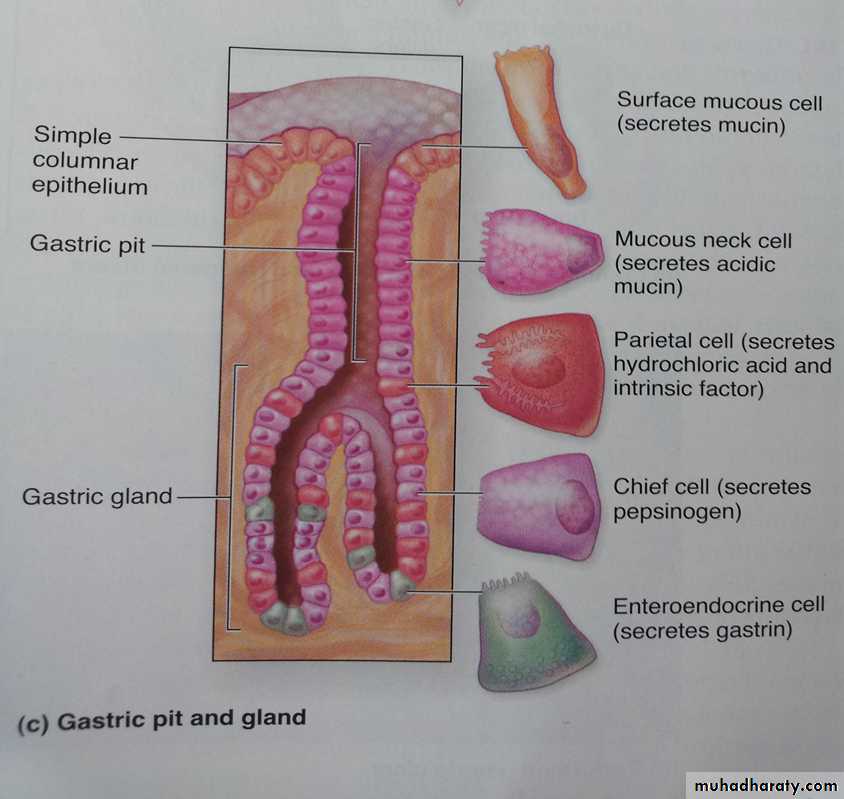 this gland is lined by 5 types of cells Mucus neck cells, Regenerative (Stem) cells, Parietal cells, Chief (Peptic) cells, Enteroendocrine cells .