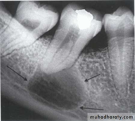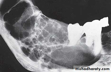 *Asymptomatic, expansile, associated with history of trauma. *Extend between the roots of teeth with scalloped border .