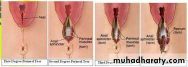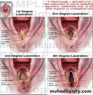 -First degree: involves the perineal skin, and the posterior vaginal wall.-Second degree: involves the previous structures + the muscles of the perineal body but not the external anal sphincter.