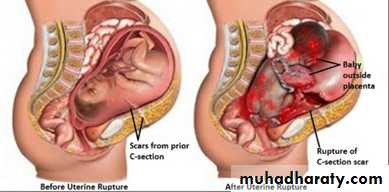 -rupture of a uterine scar eg. previous CS mainly upper segment CS, myomectomy, hysterotomy.