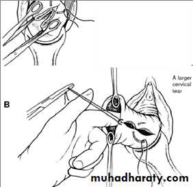 Immediate repair: is carried out under general anaesthesia with good light exposure.Interrupted cut gut dexon or vicryl sutures are taken starting from above the apex of the tear to control bleeding from the retracted blood vessels.