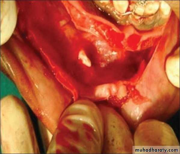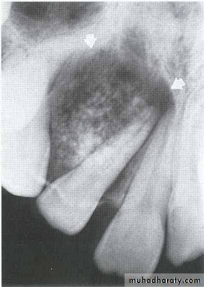 • * Arises from attached gingiva & with growth cupping the cortical plate.• *The teeth are vital.