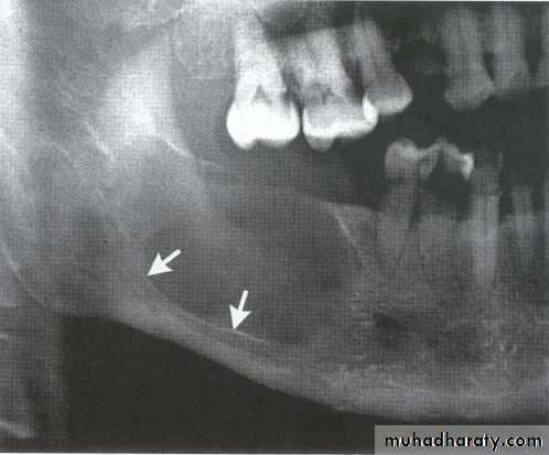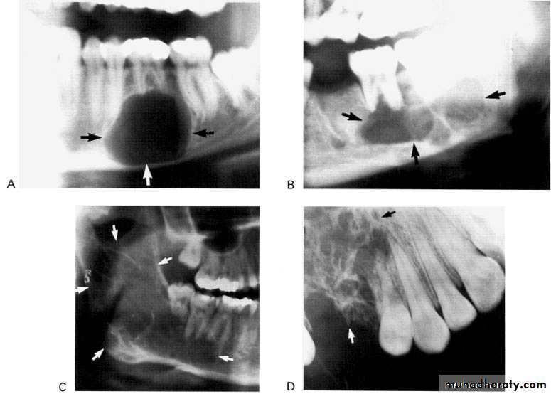 *Asymptomatic, expansile, associated with history of trauma. *Extend between the roots of teeth with scalloped border .