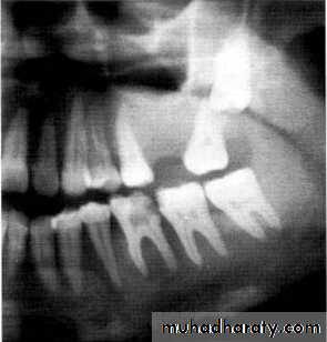 Odontogenic keratocyst:*This cyst develops from the epithelium of the dental lamina instead of the normal tooth which is therefore typically missing from the series.