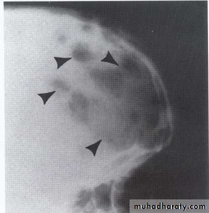 • Multiple radiolucent foci seen in the skull & long bone of the skeleton, lesion in the skull give appearance of geographic map , with skull enlargement .