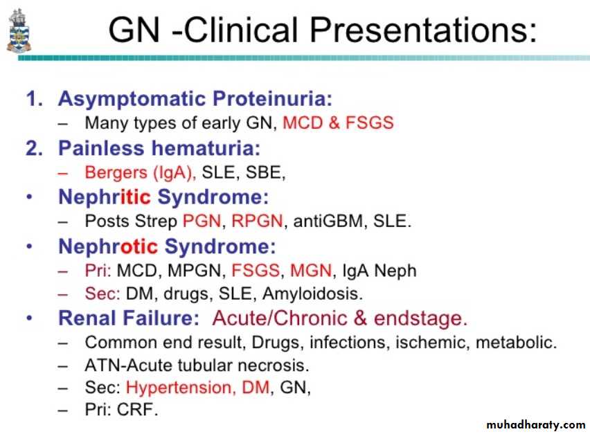 Primary Glomerulonephritisacute proliferative GN (APGN).Rapidly progressive RPGNMembranous MGNLipoid nephrosis (minimal change disease)MCDFocal segmental glomerulosclerosis FSGMembranoproliferative MPGNIgA NephropathyChronic GN